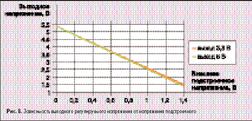 Подстроечное напряжение отсчитывается относительно отрицательного выхода напряжения. Преобразователь имеет линейную зависимость выходного регулируемого напряжения от подстроечного (рис. 8).