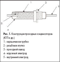 Конденсатор КТП состоит из керамической трубки с нанесенными на нее внутренним и внешним электродом, внутри которой проходит вывод, связывающий источник питания и нагрузку. К внешнему электроду припаяна резьбовая втулка, служащая элементом крепления, через которую помехи отводятся «на землю» (рис. 1).