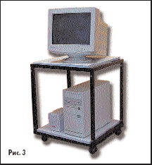 Предусмотренные конструкцией полки позволяют разместить системный блок компьютера, источник бесперебойного питания и монитор или приборы стандартной ширины (19 дюймов). Стойка оборудована колесами и при необходимости закатывается под рабочий стол.