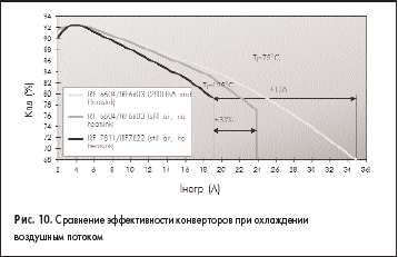 При максимальном рабочем токе (для корпуса SO-8), токе в фазе конвертора (16 А), температура кристалла транзисторов в корпусе SO-8 равна 125 °С. При этом же токе конвертор на транзисторах DirectFET имеет на 5 % более высокий КПД, а температура кристаллов ниже на 50 °С. Чипсет на транзисторах DirectFET позволяет поднять ток в фазе на 37 %, но и при этом температура кристалла не превышает 105 °С. Еще большее преимущество дает применение принудительного охлаждения (рис. 10).
