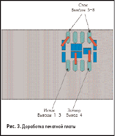 Для этого устанавливаются перемычки минимальной длины (красный цвет) между контактными площадками под корпус SO-8 (зеленый цвет) и дополнительными контактными площадками под корпус DirectFET (голубой цвет).
