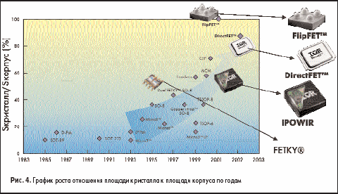 Сначала появились сдвоенные транзисторы в корпусе SO-8 и был достигнут уровень отношения 40 %, затем приборы Dual Fetky (к двум кристаллам транзисторов добавлен кристалл диода Шоттки) с уровнем отношения 45–50 % и, наконец, Leadless («безвыводной») SO-8 c уровнем отношения 60 %. На этом же уровне находятся современные разработки приборов в корпусах BGA. Исключение конечно составляют приборы типа FlipChip (у IR серия МОП-транзисторов такого типа получила название FlipFET), где достигнут уровень 100 % по причине отсутствия корпуса как такового.