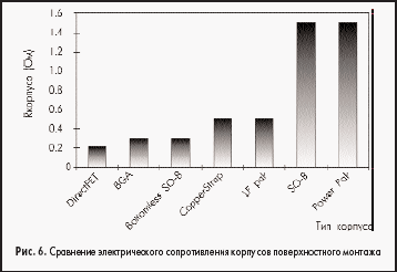 Кроме того, высота корпуса DirectFET значительно меньше, чем у классического корпуса SO-8 и всех его модификаций, что еще более сокращает дистанцию от кристалла до контакта на плате. Она составляет всего 0,7 мм вместо 1,75 мм (рис. 5), что обеспечивает кратчайший путь для передачи тепла и электрического тока. Следствием этого является рекордно низкое электрическое сопротивление корпуса DirectFET — всего 0,2 мОм (рис. 6).