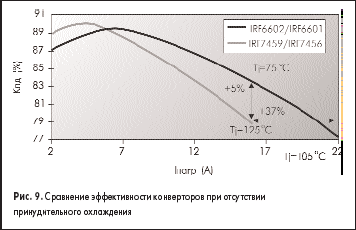 неизолированном DC/DC-конверторе (12/1,3 В) на частоте 300 кГц при отсутствии принудительного охлаждения чипсетов IRF7459/IRF7456 в корпусах SO-8 и IRF6602/IRF6601 в корпусах DirectFET, у которых кристаллы изготовлены по одной и той же полосковой планарной технологии и имеют равные размеры, демонстрируют значительное преимущество новых транзисторов (рис. 9).