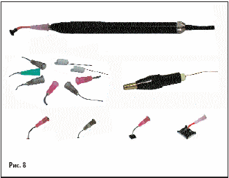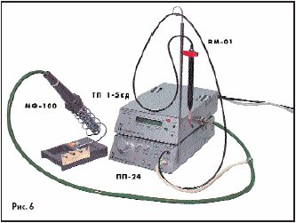Нагревательный прибор микрофен МФ-100 (рис. 6, 7) предназначен для локального плавления малых доз припоев, паяльных паст и других легкоплавких материалов. Плавление осуществляется потоком разогретого воздуха или инертного газа, вытекающего из наконечника микрофена.