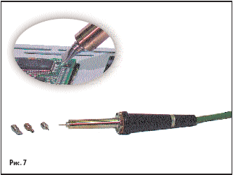 С помощью щелевого наконечника обдуваются в основном выводы, а не корпус микросхемы, поэтому температуру воздуха можно несколько увеличить для сокращения времени пайки. При такой пайке, для улучшения теплоотвода от корпуса микросхемы, на нее можно положить гладкую медную пластину такого же размера.