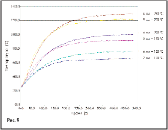 Для предварительной отладки на плату устанавливают один или несколько контрольных датчиков в различные места и, меняя зазор и температуру рабочей поверхности прибора подогрева, добиваются того, чтобы плата прогревалась до температуры 100–125 °С за 3–5 минут (рис. 9). При указанной температуре из паяльной пасты испаряются летучие соединения, что в дальнейшем предотвращает закипание и разбрызгивание припоя.