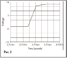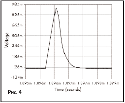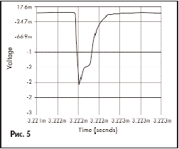Из рис. 2 можно определить продолжительность переходного процесса при включении полевого транзистора. Напряжение на гейте меняет свое значение от 0 до +5 В за время, равное 67 нс. Из рис. 3 можно определить продолжительность переходного процесса при выключении мощного транзистора. Напряжение на гейте меняется в интервале от 12 до 0 В за время, равное 45 нс. Форма зарядных токов для входной емкости транзистора при включении и выключении показана соответственно на рис. 4 и 5. Для этой цели
