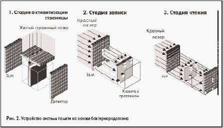 Для возврата протеина в состояние покоя используется красный записывающий лазер, располагаемый под прямым углом по отношению к желтому. Второй SLM также управляется матрицей двоичных данных и, таким образом, создает на пути луча соответствующую маску, поэтому облучению подвергнутся только определенные точки страницы. Молекулы в этих местах перейдут в Q-состояние и будут представлять двоичную единицу. Оставшаяся часть страницы возвратится в первоначальное bR-состояние и будет представлять двоичные нули. Для того чтобы прочитать данные, надо опять использовать страничный лазер, который переводит читаемую страницу в Q-состояние. Это делается для того, чтобы в дальнейшем с помощью различия в спектрах поглощения идентифицировать двоичные нули и единицы. Через две миллисекунды после этого страница облучается красным лазером низкой интенсивности излучения. Низкая интенсивность нужна для того, чтобы предупредить переход молекул в Q-состояние. Молекулы, представляющие двоичный нуль, поглощают красный свет, а представляющие двоичную единицу — не реагируют на него. Это создает «шахматный» рисунок из светлых и темных пятен на LCD-матрице, которая считывает страницу цифровой информации.