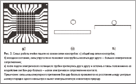 Простым и эффективным решением явилось использование прямоугольной сетки нанотрубок одновременно в качестве матрицы ячеек памяти и устройств ввода-вывода. Такая структура обеспечивает бистабильное электростатически переключаемое состояние в каждом пересечении сетки нанотрубок. Детальный анализ показал, что сила упругости, возникающая в момент, когда верхняя нанотрубка максимально удалена от нижней, и силы Ван дер Ваальса, возникающие при сближении трубок в точке их пересечения, определяют два ярко выраженных энергетических состояния ячейки памяти. В первом состоянии переходное сопротивление между нанотрубками велико, во втором состоянии — мало. Обеспечивая электрически притягивающие и отталкивающие силы между нанотрубками, можно вводить данные. Так как электростатическое воздействие прикладывается только к концу конкретной нанотрубки, а не к каждой ячейке памяти, проблема соединения «макромира» и «микромира» в значительной мере будет решена.