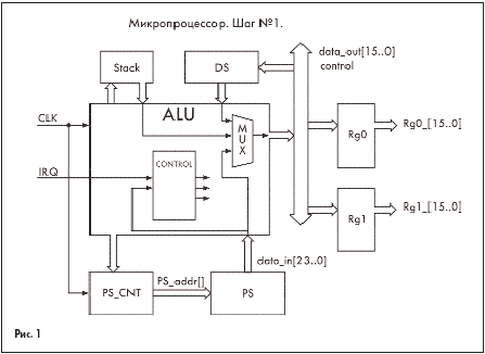 Для ALU — это будут коды команд микропроцессора. Блоки DS, Stack, Rg0 и Rg1 обмениваютя сигналами с блоком ALU по одной внутренней шине данных.