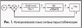Для примера рассмотрим структуру одной из наиболее распространенных следящих систем — системы термостабилизации, функциональная схема которой приведена на рис. 1. Такая система должна содержать датчик температуры, корректирующий усилитель, нагреватель и измеритель температуры. Усилитель коррекции (интегро-дифференцирующее звено) имеет следующую передаточную характеристику: