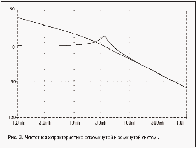 Коэффициент К3 включен в описание схемы для того, чтобы иметь возможность исследовать частотную характеристику как разомкнутой, так и замкнутой системы (при К3=1). Обе частотные характеристики можно увидеть на графиках, приведенных на рис. 3. Значения коэффициента К3 мы задали следующим образом: