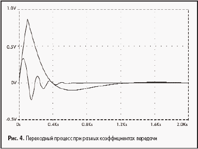 На эпюрах рис. 4 вы можете увидеть сигнал ошибки при таком воздействии. Как и следовало ожидать, при увеличении коэффициента передачи уменьшается ошибка и увеличивается колебательность.