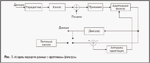 Структура КИХ-фильтра удобна для построения алгоритмов адаптивных фильтров. В качестве примера реализации адаптивного фильтра рассмотрим использование фильтра КИХ для коррекции искажений в канале связи при цифровой передаче данных. На рис. 1 представлена общая модель, использующаяся при проектировании алгоритмов адаптивной фильтрации.