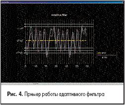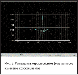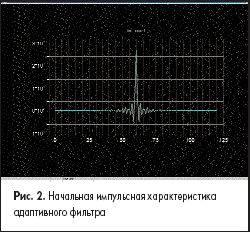 На рис. 2–4, полученных с использованием встроенных средств отображения VisualDSP++, показана импульсная характеристика фильтра до подстройки коэффициентов и после работы алгоритма адаптивной подстройки. На рисунках видно, как изменяется импульсная характеристика фильтра в процессе работы алгоритма. На последнем рисунке представлены результаты работы фильтра. Синим цветом показан исходный сигнал, подаваемый на вход кодека, красным цветом — сигнал с внесенными в него искажениями, а желтым — полученный после включения адаптивного фильтра сигнал ошибки.