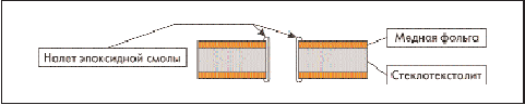 Вернемся к отслаиванию, какие же факторы влияют на отслаивание? Начнем со сверловки отверстий, подлежащих металлизации. При сверлении отверстий необходимо соблюдать некоторые параметры: учитывать диаметр отверстия, скорость вращения сверла, угол в плане, угол затыловки, остроту сверла и т. д. При некачественном сверлении на стенках отверстия и местах будущей контактной площадки образуется «налет» из эпоксидной смолы (см. рис.).