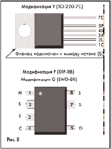 Микросхемы выпускаются в вариантах Y (корпус ТО-220-7С), Р (корпус DIP-8В) и G (корпус SMD-8B). В зависимости от типа корпуса, семейство TOPSwitch-GX имеет 1–3 дополнительных вывода помимо стандартных «управление», «сток» и «исток».