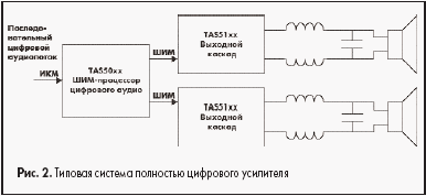 Здесь гораздо яснее, чем в случае ШИМ-процессоров, просматривается предназначение каждого устройства, его нацеленность на конкретный рыночный сектор. Так, одноканальные усилители TAS5100A и TAS5110 предназначены для построения высококачественных систем с любым количеством выходных каналов различной мощности, а двухканальный TAS5101 явно нацелен на применение в стереофонических мини- и микросистемах, в том числе и с автономным питанием.