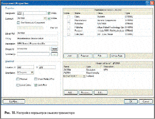 - Прежде чем щелкнуть левой кнопкой мыши в поле схемы и поставить транзистор в нужное место, отредактируем его параметры, для чего нажмем клавишу Tab. Откроется диалоговое окно, изображенное на рис. 10.