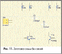 В результате проделанных операций мы получили схему без связей, изображенную на рис. 11. То, что между элементами оставлено много свободного места, сделано умышленно, чтобы понять основные принципы прорисовки связей. Заметим, что все компоненты нарисованы по международным стандартам, что не соответствует принятой в России системе условных графических изображений, регламентированной ГОСТ 2.701-84.