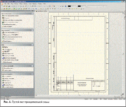 Для быстрого задания параметров листов схем можно использовать заранее созданные специальные шаблоны или имеющиеся листы схем. Шаблоном называется заготовка листа принципиальной схемы с установленными параметрами, сохраненная в файл с расширением .DOT. Шаблоны листов схем с рамкой и основной надписью по ГОСТ в масштабе 1 мм = 2 дискрета можно получить у автора данной статьи. Смена шаблона осуществляется с помощью команды Design/Template/Set Template File Name, после выполнения которой лист схемы примет вид, показанный на рис. 6.