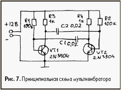 После проделанных выше операций мы готовы начинать рисовать принципиальную схему. В качестве примера возьмем простую схему транзисторного мультивибратора и от руки набросаем ее на бумаге, чтобы было легче повторить в редакторе схем (рис. 7).