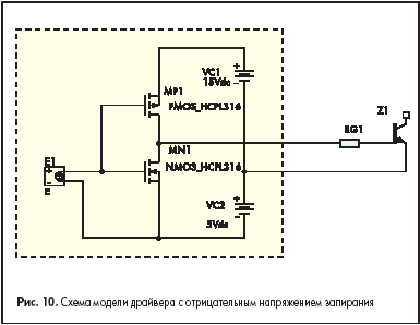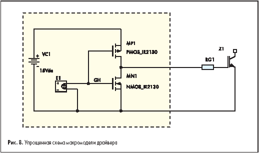 Как видно из графиков и таблицы, по ряду параметров характеристики стандартной модели транзистора IRGPC50F имеют серьезные расхождения со значениями, приведенными в технических данных. Очевидно, если протестировать какую-нибудь другую модель, несоответствия также будут иметь место. Однако это, конечно, не является препятствием для того, чтобы использовать данную модель при разработке схемы. Разработчик должен представлять себе, к чему могут привести отклонения по определенным параметрам. Ответственность за последствия в любом случае будет лежать на разработчике, как это было всегда. Соответственно, он и должен принимать решение. В любом случае разработку импульсного силового каскада надо начинать с теплового расчета. Применение программ схемотехнического моделирования для такого расчета крайне нежелательно. Конечно, есть соблазн вывести на экран среднеквадратичное значение произведения тока и напряжения и получить таким образом суммарные потери каскада. Однако точность такого метода всегда будет гораздо ниже, чем при нормальных вычислениях. Методика теплового расчета достаточно хорошо изложена в технической литературе [1]. А схемотехническое моделирование предназначено для решения схемных проблем, и применять его надо по назначению, о чем мы и поговорим далее. Очень интересным объектом для моделирования является проверка «совместимости» стандартного драйвера MOSFET/IGBT и силового транзистора. Мы знаем, что, например, драйвер трехфазного моста IR2130 может без проблем управлять транзисторами с током коллектора 10–15 А. А что будет, если попробовать подключить его к более мощным модулям, хватит ли его выходного тока для коммутации заряда затвора, закончатся ли переходные процессы за время задержки переключения tdt, равного для данной микросхемы 2,5 мкс? Для ответа на этот вопрос нам придется создать макромодель драйвера IR2130, точнее одного его каскада. При этом все сервисные и защитные функции мы опустим, так как любое неоправданное усложнение модели приводит только к увеличению времени расчета и, в худшем случае, может вызвать несходимость (convergence problem) при расчете рабочей точки. Для достаточно точного отображения работы драйвера в силовом каскаде нам понадобятся, прежде всего, входные и выходные параметры драйвера: уровни управления и выходные токи. На рис. 8 приведена упрощенная схема макромодели драйвера и управляемый транзистор. Вход драйвера — ИНУН (источник напряжения, управляемый напряжением), обозначаемый в библиотеках OrCad буквой E.