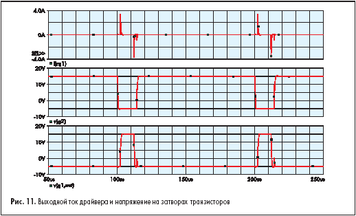 На рис. 11 приведены эпюры, аналогичные рис. 9, за исключением верхнего графика, на котором вместо сквозного тока (которого теперь нет) показан выходной ток драйвера.
