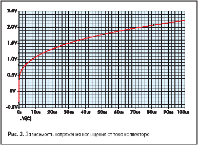 Для определения зависимости напряжения насыщения от тока мы заменим источник питания с фиксированным напряжением Vcc на источник пилообразного напряжения, обозначенный на схеме Vsaw. Его напряжение изменяется таким образом, чтобы ток коллектора, нарастал от минимального до максимального значения (Ic = 100 A при V2 = 500 В при RL = 5). Поскольку график Uce(on) = f (Ic) дается для тока коллектора в диапазоне примерно от 0 до 100 А, время нарастания напряжения на коллекторе выбрано 100 мкс (TR = 100u). При этом временная горизонтальная ось численно будет совпадать со значением тока коллектора. Полученный график приведен на рис. 3. Мы не стали совмещать эту эпюру с реальной, так как совпадение оказалось практически полным.