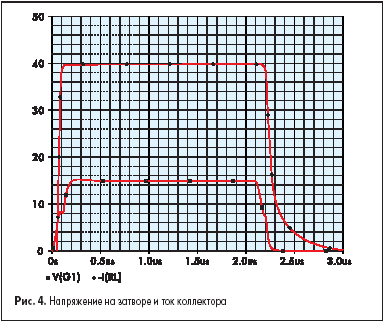 Кстати, после генерации текстового входного файла (PSPICE/Create Netlist) не забудьте включить в него команду .IC V(G)=0, задающую начальные условия. Иначе включение транзистора может начаться не с нулевого напряжения на затворе. Для тестирования режимов включения и выключения на затвор подаются прямоугольные импульсы от источника VIN. Нормированный ток коллектора и напряжение на коллекторе задаются с помощью источника постоянного напряжения Vcc и резистора нагрузки RL. Для тестирования мы взяли (совершенно произвольно) имеющуюся в библиотеке модель транзистора IRGPC50F. На полученный график заряда затвора (рис. 2) нанесена соответствующая эпюра, взятая из технических характеристик транзистора. Обратите внимание, что после горизонтального участка (образующегося из-за обратной связи через емкость Миллера) графики расходятся, что может привести в дальнейшем к ошибкам при моделировании. Это еще раз подтверждает необходимость тщательной проверки каждой используемой модели.