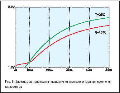 - Настраивается напряжение насыщения Vсе(on). Для этого можно варьировать величину сопротивления R2, но в этом случае невозможно смоделировать температурную зависимость напряжения насыщения. Поэтому R2 примем равным 0,01 Ом, а изменение напряжения насыщения от тока коллектора зададим с помощью резистора RC. На рис. 5 приведены графики зависимости напряжения насыщения от тока коллектора испытуемого транзистора (ток изменяется от 1 до 50 А за 50 мкс по оси Х) при трех значениях резистора RС — 0,05, 0,1 и 0,15 Ом. При RС = 0,1 Ом, напряжение насыщения соответствует справочной величине 1,7 В.