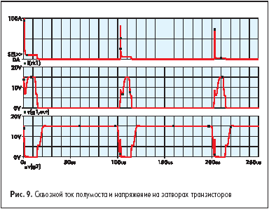 При такой записи для входных сигналов в цепи с именем IN устанавливается уровень логического нуля — 0,8 В и уровень единицы — 2,2 В (справочные данные на IR2130). Между этими точками осуществляется линейная интерполяция. Для входных сигналов с уровнем, большим 2,2 В, на затворах пары полевых транзисторов MN1, MP1 установится напряжение 15 В. Это необходимо для точного задания выходных токов драйвера. Далее необходимо разработать символы и математические модели двух транзисторов MOSFET — n-канального и р-канального. В нашей схеме они называются NMOS_IR2130 и PMOS_IR2130. Для этого нужно запустить программу PSpice Model Editor, входящую в пакет OrCad, открыть библиотеку MOSFET транзисторов pwrmos.lib и создать две новых модели, сохранив их под теми же именами, что и у символов элементов. При разработке модели полевых транзисторов для выходного каскада драйвера требуется только указать тип канала и в режиме Transfer Curve задать соответствующий ток стока Id при напряжении на затворе Vgs = 15 B. У драйвера IR2130 ток стока должен быть 0,4 А для n-канального транзистора и 0,2 А — для р-канального. Для питания драйвера применен «плавающий» источник напряжения VC1. Учтите также, что в нашей схеме драйвер получается инвертирующим, как и IR2130. По указанной методике вы можете разработать макромодель любого драйвера, установив уровни входных сигналов и выходные токи в соответствии с техническими характеристиками. Если сделать источник питания драйвера двуполярным, то можно запирать транзистор отрицательным сигналом, как это делается в ряде стандартных микросхем управления. Изготовив драйвер, мы можем моделировать силовой каскад. Пусть это будет полумост с индуктивной нагрузкой. В качестве силовых транзисторов полумоста используем IGBT фирмы EUPEC — BSM100GB100D, имеющиеся в библиотеке igbt.olb OrCad. Эти транзисторы имеют полный заряд затвора Qg = 1100 нКл. Средний ток коллектора для них составляет 100 А при 80 °С. В качестве антипараллельных диодов можно взять, например, HFA25PB120 из библиотеки diode.olb. На входы драйверов от двух источников импульсного сигнала подаются прямоугольные импульсы с постоянным коэффициентом заполнения — в нашем случае D = 0,1. Импульсы источников необходимо сместить друг относительно друга так, чтобы транзисторы открывались в противофазе и время задержки переключения составляло 2,5 мкс, что соответствует времени tdt для IR2130. Резисторы затвора RG установлены равными 5 Ом (рекомендуемое значение для данного типа транзисторов). При этом токи затвора будут ограничиваться не резистором затвора, а выходным сопротивлением драйвера. Напомним, что ток включения/выключения для IR2130 составляет 0,2/0,4 А. Кстати, если при расчете возникнут проблемы сходимости и программа сообщит: ERROR — Convergence problem in transient bias point calculation, можно уменьшить точность расчета. Делается это в меню Options команды PSpice/Edit Simulation Profile. Результаты моделирования приведены на рис. 9. Обратите внимание на напряжение на затворах транзисторов.