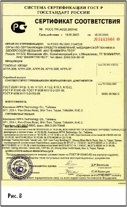 Сертификат в системе ГОСТ-Р может выдаваться или на партию товара или на срок до трех лет, в зависимости от схемы сертификации. Для импортных СИ, если они включены в перечень продукции, подлежащей обязательной сертификации, без этого сертификата невозможно таможенное оформление при пересечении границы РФ. Наиболее жесткой является схема 3а, предусматривающая обследование условий производства. В нашем случае обследование производств компаний GOOD WILL, APPA, SEW, Motech производилось такими институтами как ВНИИФТРИ, Нижегородский ЦСМ, ВНИИМС под руководством специалистов Управления метрологии Госстандарта РФ. Затраты на проведение необходимых испытаний определяются, исходя из схемы сертификации, сложности изделия, необходимости аренды дополнительного оборудования и т. д. После получения сертификата в системе ГОСТ-Р или на документацию, или на тару, или на корпус прибора наносится знак соответствия, с обозначением лаборатории, которая его выдала. К примеру, на рис. 9 изображен знак соответствия лаборатории «ВНИИФТРИ-ТЕСТ». Этот знак ошибочно называют «значок Ростеста», что неправильно. Сам символназывается «знак соответствия», а код АЮ26 — это код, под которым орган по сертификации внесен в Государственный реестр органов по сертификации и позволяет идентифицировать лабораторию. Так что если вам предлагают прибор со знаком АЯ46 (Ростест-Москва), а сертификат выдан в Магадане — выводы не требуют комментария.