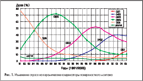Область применения компонентов Yageo не поддается охвату — это компьютерное, телекоммуникационное оборудование, бытовая и автомобильная техника, промышленное оборудование, средства мобильной связи, медицинская техника и многое-многое другое. Цель этой статьи не только познакомить читателей с продукцией, но также раскрыть некоторые особенности применения высокотехнологичных компонентов в условиях российских предприятий. Не секрет, что основной тенденцией развития мировой электронной промышленности является миниатюризация. Как следствие, требуется применение все более миниатюрных электронных компонентов. Не стала исключением и продукция Yageo. С течением времени падает спрос на элементы больших размеров и увеличивается на более миниатюрные. На рис. 1 представлено изменение мирового спроса на конденсаторы поверхностного монтажа различных размеров в период с 1980 по 2006 год (прогноз по данным ведущих мировых аналитиков).
