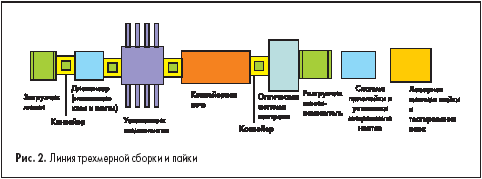В состав линии входит специальный модуль установки компонентов на разных горизонтальных уровнях. Вне линии устанавливается устройство нанесения клея и установки микрокомпонентов и лазерная система пайки. В качестве тестирующей системы предлагается контроль по признакам внешнего вида с использованием видеоизображения. Тестирование производится сравнением видеоизображений эталона и рабочего образца. Примечательны технологические решения, позволяющие отказаться от пайки волной припоя. Для этого специальная паяльная паста при трафаретной печати продавливается в отверстия. Реологические свойства этой пасты таковы, что она при установке выводов компонентов в отверстия не выдавливается, а обволакивает вывод, и при последующем нагреве в печи, расплавляясь, образует качественную галтель припоя с заполнением отверстия. Тем не менее, рынок электронных модулей не уменьшил, а даже увеличил объем продаж конструкций с пайкой выводов в отверстия. Фирмы, специализирующиеся на поставках оборудования для «дырочного» монтажа, успешно развиваются, предлагая новые модификации. Весьма успешно в этой области продвигается фирма Royonic, предлагая широкий ряд оборудования для установки «дырочных» компонентов. В том числе универсальные установки для формовки и подрезки выводов (VersaCLINCH™ Cut-and-Clinch Module 590). Наиболее известны серии полуавтоматов с лазерными целеуказателями. В России оборудование фирмы Royonic можно увидеть в работе в г. Юрьев-Польский (Владимирская обл.) на заводе «ПРОМСВЯЗЬ». Среди новинок фирмы — портативный цеховой склад с высокоскоростной системой поиска и выгрузки ленточных кассет с компонентами (рис. 4). На стеллаже умещаются 550 кассет, при этом можно найти и получить все необходимое в течение 5 секунд.