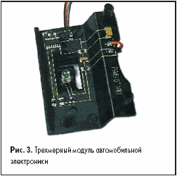 Были продемонстрированы возможности сборки и пайки трехмерных модулей на металлическом основании (рис. 2). Предметно, это автомобильная электроника, размещаемая непосредственно на неплоских поверхностях узлов и металлических элементов автомобиля, вписываясь в их профиль (рис. 3).