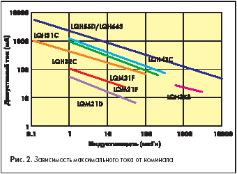 Катушки первого варианта содержат в конструкции сердечник из окиси алюминия с вертикальным расположением проволочной обмотки (рис. 1-а). Такое строение имеют катушки серий LQW2BH, LQ W31H. Индуктивности этих серий являются высокочастотными и предназначены для работы на частотах до 6 ГГц в зависимости от номинала. Эти серии отличаются высокой добротностью и большими токами. Индуктивности второго варианта представляют собой многослойные конструкции (рис. 1-б), где в качестве каркаса используется специальное стекло. Обмотка в таком варианте выполнена пленочным проводником, нанесенным несколькими слоями внутри каркаса, что позволяет получить индуктивность для высокочастотного диапазона с малыми размерами корпуса и достаточно большими токами. В этом корпусе выполнены серии LOG15H и LOG18H. Конструкция третьего варианта (рис. 1-в) изготовлена на стеклянной основе однослойным пленочным проводником. В такой конструкции исполнены серии LQP03T и LQP15M. Индуктивности этих серий обладают малым отклонением номинала и имеют рекордно малые размеры (0,6х0,3х0,3 мм). Приборы этого типа являются перспективными особенно в сложных малогабаритных переносных электронных устройствах, например, таких, как мобильные телефоны. Катушки четвертого варианта (рис. 1-г) отличаются от других горизонтальной проволочной обмоткой. При этом каркас катушки выполнен из окиси алюминия, а корпус сверху покрыт полимерным материалом, который защищает и фиксирует обмотку. В этом варианте выпускаются серии LQW15A и LQW18A, обладающие хорошей точностью номиналов за счет фиксации обмотки. Серия LQW15A допускает работу в широком температурном диапазоне от –50 до +125 °C. Верхняя частота работы индуктивностей ограничена частотой собственного резонанса и для некоторых индуктивностей этих серий она составляет 11–18 ГГц. Низкочастотные индуктивности общего применения и дроссельные индуктивности производятся в таком же конструктивном исполнении, только материал каркаса выполнен из более простой керамики. Дроссели серий LQH66S, LQH3KS и LQH3ER изготавливаются в корпусах с вертикальной обмоткой и экранирующей крышкой.Максимальный допустимый ток определяется номиналом и конструкцией катушки индуктивности. На рис. 2 изображен график, показывающий зависимость допустимого тока от величины индуктивности катушки дляразных серий.