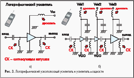 Применение индуктивностей MuRata Катушки индуктивности для ВЧ-диапазона, например, могут использоваться в таких каскадах портативных телефонов, как: - Логарифмический узкополосный усилитель, усилитель мощности (рис. 3).
