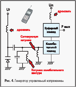 В дроссельной цепи усилителя могут использоваться проволочные и многослойные типы катушек, которые подходят по величине проходящего тока. Из проволочных катушек рекомендуются серии LQW15A, LQW18A. Из многослойных катушек рекомендуется серия LQG15H. В согласующих цепях логарифмического усилителя должны в принципе использоваться прецизионные и высокодобротные катушки. Катушка тонкопленочного типа подходит для приемной цепи, особенно где требуется катушка с точным номиналом. Для этого применения рекомендуются следующие серии катушек: пленочные LQP15M, проволочные LQW15A и LQW18A, многослойные LQG15H. В усилителе мощности токи через дроссели могут превышать 1 А, поэтому там должны использоваться проволочные катушки на соответствующие токи, например, серия LQW2BH. - Генератор, управляемый напряжением (рис. 4).
