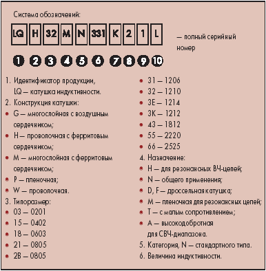 Серия | Типо.-раз.-мер | Размер, мм | Диапазон номиналов | Допуск, % (нГн) | Допусти-мый ток, мА | Сопротив-ление обмотки, Ом | Резо-нансная частота, МГц | Рабочая темпера-тура, С | Конструк-тивное исполнение | LQH31M | 1206 | 3.2х1.6 | 0.15ё100 мкГн | 5%, 10% | 45ё250 | 0.55ё15.6 | 7ё250 | –25ё+85 | Проволочные | LQH32M | 1210 | 3.2х2.5 | 0.1ё560 мкГн | 5%, 10%, 20% | 40ё700 | 0.5ё28 | 5ё200 | –25ё+85 | Проволочные | LQH43M(N) | 1812 | 4.5х3.2 | 1ё2200 мкГн | 5%, 10%, 20% | 30ё500 | 0.2ё50 | 1.3ё120 | –25ё+85 | Проволочные | LQM18N | 0603 | 1.6х0.8 | 47ё2200нГн | 10%, 20% | 15ё50 | 0.3ё2.1 | 50ё245 | –40ё+85 | Многослойные | LQM21N | 0805 | 2.0х1.25 | 0.1ё4.7 мкГн | 10% | 30ё250 | 0.26ё1.0 | 47ё340 | –40ё+85 | Многослойные | LQH3ER | 1214 | 3.2х3.5 | 1ё100 мкГн | 2%, 5% | 10ё70 | 0.25ё8.58 | 10ё120 | –25ё+85 | Проволочные | LQG15H | 0402 | 1.0х0.5 | 1.2ё120 нГн | 5%, 0.3 | 150ё200 | 0.1ё1.6 | 600ё6000 | –40ё+85 | Многослойные | LQG18H | 0603 | 1.6х0.8 | 1.2ё100 нГн | 5%, 0.3 | 300 | 0.1ё0.9 | 800ё6000 | –40ё+85 | Многослойные | LQP03T | 0201 | 0.6х0.3 | 0.6ё15 нГн | 5%, 0.2 | 90ё400 | 0.08ё1.5 | 3300ё6000 | –40ё+85 | Плёночные | LQP15M | 0402 | 1.0х0.5 | 1ё33 нГн | 2%, 5%, 0.1, 0.2 | 60ё400 | 0.1ё3.8 | 2100ё6000 | –40ё+85 | Плёночные | LQW15A | 0402 | 1.0х0.5 | 1.5ё56 нГн | 3%, 5%, 0.2, 0.5 | 200ё1000 | 0.03ё1.17 | 2800ё 18000 | –50ё+125 | Проволочные | LQW18A | 0603 | 1.6х0.8 | 2.2ё470 нГн | 2%, 5%, 0.2, 0.5 | 75ё1400 | 0.018ё7.0 | 700ё18000 | –25ё+85 | Проволочные | LQW2BH | 0805 | 2.0х1.5 | 2.7ё470 нГн | 2%, 5%, 10%,0.5 | 160ё1900 | 0.02ё2.8 | 350ё6000 | –25ё+85 | Проволочные | LQW31H | 1206 | 3.2х1.6 | 8.8ё100 нГн | 5%,10% | 230ё750 | 0.04ё0.42 | 900ё1000 | –25ё+85 | Проволочные | LQH31H | 1206 | 3.2х1.6 | 54ё880 нГн | 10% | 180ё920 | 0.04ё1.12 | 200ё800 | –25ё+85 | Проволочные | LQH31C | 1206 | 3.2х1.6 | 0.15ё100 мкГн | 5%, 10% | 45ё200 | 0.55ё15.6 | 7ё250 | –25ё+85 | Проволочные | LQH32C | 1210 | 3.2х2.5 | 0.15ё560 мкГн | 10%, 20% | 60ё1450 | 0.036ё28.6 | 5ё400 | –25ё+85 | Проволочные | LQH43C | 1812 | 4.5х3.2 | 1ё470 мкГн | 10%, 20% | 90ё1080 | 0.08ё8.5 | 3ё100 | –25ё+85 | Проволочные | LQM21D | 0805 | 2.0х1.25 | 1ё47 мкГн | 30% | 7ё220 | 0.1ё1.2 | 7.5ё105 | –40ё+85 | Многослойные | LQM21F | 0805 | 2.0х1.25 | 1ё47 мкГн | 30% | 7ё220 | 0.1ё1.2 | 7.5ё105 | –40ё+85 | Многослойные | LQM31F | 1206 | 3.2х1.6 | 10 мкГн | 20% | 70 | 0.5 | 20 | –40ё+85 | Многослойные | LQH55D | 2220 | 5.7ё5.0 | 0.12ё10000 мкГн | 20% | 50ё6000 | 0.01ё140 | 0.5ё450 | –25ё+80 | Проволочные | LQH3KS | 1212 | 3.3х3.3 | 560ё2200 мкГн | 30% | 20ё50 | 10.14ё36.4 | 1.5ё3.0 | –25ё+85 | Проволочные | LQH66S | 2525 | 6.3х6.3 | 0.27ё10000 мкГн | 20% | 50ё6000 | 0.01ё55.58 | 0.5ё300 | –25ё+80 | Проволочные |