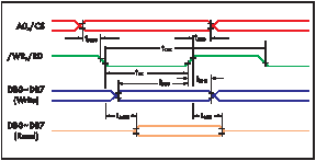Таблица 3 Parameter | Condition | Symbol | Min | Max | Unit | Remark | Address Hold Time | CL=100 pF VDD=2.7~4.5 | tAH8 | 10 | | ns | A0,/CS | Address Setup Time | tAW8 | 0 | | ns | System Cycle Time | tCYC | Note | | ns | /WR,/RD | Strobe Pulse Width | tOC | 150 | | ns | Data Setup Time | tDS8 | 120 | | ns | DB0~DB7 | Data Hold Time | tDH8 | 5 | | ns | /RD Access Time | tACC8 | - | 80 | ns | Output Disable Time | tOH8 | 10 | 55 | ns |