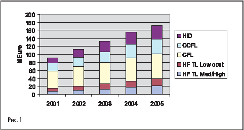 Хорошо знакомо раздражающее действие мерцающих люминесцентных ламп, которые к тому же часто еще и гудят. Однако немногие понимают, что такое качество люминесцентных ламп обеспечивается главным образом электромагнитным балластом. Отсюда и традиционное прохладное отношение к люминесцентным лампам. Сейчас редко у кого в квартире можно встретить светильники с люминесцентными лампами. Вместе с тем в мире уже давно и успешно используются люминесцентные светильники с электронным балластом, позволяющие получать безопасное, надежное и дешевое освещение. На рис. 1 приведен прогноз роста производства интегральных схем для электронных балластов [1]. Видно, что к 2005 году общий объем продаж этой продукции может достигнуть 400 млн евро в год.