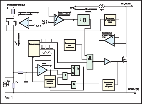 D (сток) — вывод соединен со стоком мощного MOSFET-транзистора, по нему подводится питание ко всей схеме управления (рис. 2). Вывод имеет соединение с внутренней схемой ограничения тока.