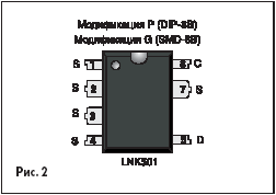 Давайте поближе познакомимся с одной из микросхем этого семейства — LNK501. Это изделие содержит в себе силовой ключ — 700-вольтовый транзистор POWER MOSFET, компаратор ограничения тока, схему отключения при перегреве, схему мягкого запуска, усилитель ошибки, генератор, ШИМ-компаратор. Упакована LNK501 в 7-ножечные корпуса стандартного размера: DIP-8B (вариант Р) и SMD-8B (вариант G), у которых отсутствует одна ножка (рис. 1).