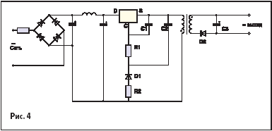 На регулировку выходного напряжения влияет напряжение на конденсаторе С2, которое, в свою очередь, зависит от ЭДС самоиндукции первичной обмотки трансформатора. Резистор R2 и конденсатор С2 образуют фильтр, на котором выделяется напряжение ошибки.