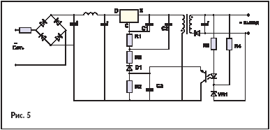 С помощью LNK501 можно строить преобразователи не только на фиксированное входное напряжение, но и универсальные (85–265 В), что немаловажно для сельской местности. К особенностям этой микросхемы можно отнести такой интересный факт, как эксплуатация без обратной связи со стороны низкого напряжения. То есть, когда не нужна высокая стабильность выходного напряжения, можно упростить схему, воспользовавшись встроенной обратной связью. Нестабильность выхода увеличивается при этом до ±10%. Если же нужна большая стабильность, в схему придется ввести оптопару.