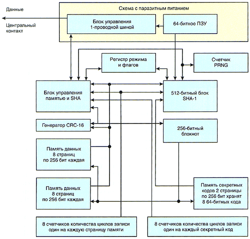 Структурная схема DS1961S приведена на рис. 1. Микросхема включает 6 основных компонентов: