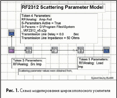 Рассмотрим моделирование широкополосного усилителя, для задания характеристик которого используются S-параметры, на примере, который можно найти в папке SystemView/Examples/RFLib/ S-Parameters/ RF2312_Fixed. Схема моделирования этого усилителя приведена на рис.1.