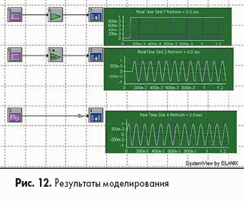 Запустим моделирование системы, тогда на выходе анализатора данных 4 мы получим синусоидальный сигнал источника 3 (рис.12), на выходе анализатора данных 7 — усиленную ступенчатую функцию, а на выходе анализатора данных 2 — ступенчатое напряжение, умноженное на изменяющееся по синусоидальному закону усиление элемента 1.